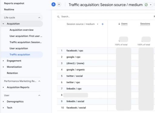 - Sol tarafta; Raporlar > Edinme > Trafik Edinme adımları ile ilerleyerek GA4’de kaynak/aracı bilgilerini bulabilirsiniz. Kaynak/araç kombinasyonlarının listesini görmek için oturum kaynağı/aracı için açılır menüyü kullanabiliriz.